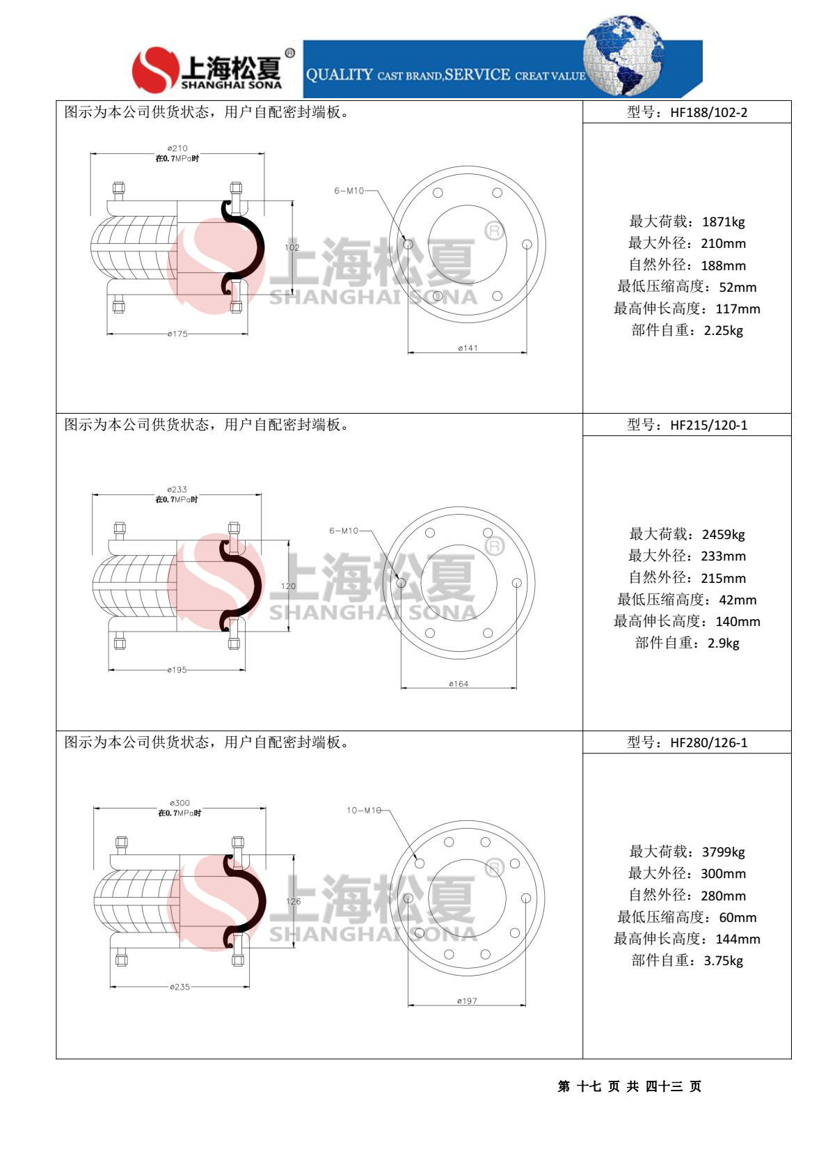 根據(jù)聯(lián)接方式可以分為叁大類:一類為固定式法蘭聯(lián)接型,空氣彈簧的兩端邊緣尺寸和曲囊.大外徑相等或略小一些,鉆若干個孔后用法蘭環(huán)和端板緊固聯(lián)接;另一類為活套式法蘭聯(lián)接型,空氣彈簧的兩端邊緣尺寸比曲囊.大外徑小得多,無須鉆孔,用一個.制的法蘭環(huán)和一個普通端板緊固聯(lián)接;.叁類為自密封型,不用法蘭聯(lián)接,壓入端板,充入壓縮空氣則自行密封。